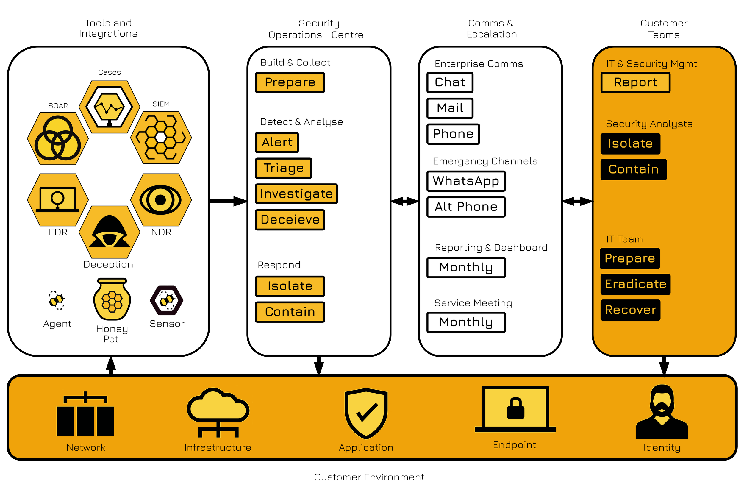 Together, the NDR, EDR, Deception, SIEM, SOAR, and Incident Management components create a unified detection and response ecosystem. Protective technologies defend the perimeter and endpoints; detective tools provide deep visibility; orchestration ties them together for faster detection, verified accuracy, and orchestrated containment — all powered by people who understand your environment.